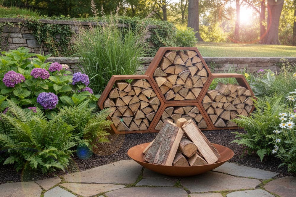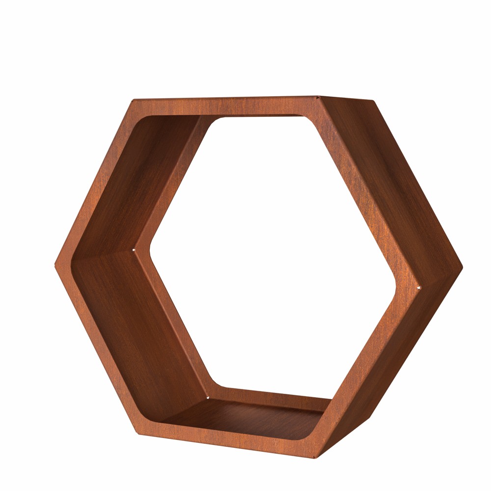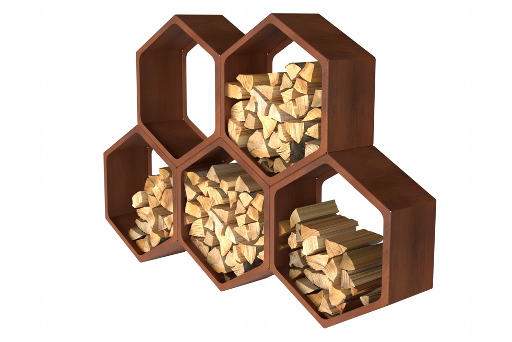 Designový dřevník ve tvaru šestiúhelníku – včelí plástve vyniká nejen svým vzhledem, ale i konstrukční pevností. Díky použití 3 mm silné cortenové oceli nabízí výjimečnou odolnost, stabilitu a dlouhou životnost. Tento zásobník na dřevo lze využít jako samostatný kus nebo lze kombinovat více kusů do větších sestav – například do celých stěn či volně stojících modulů.