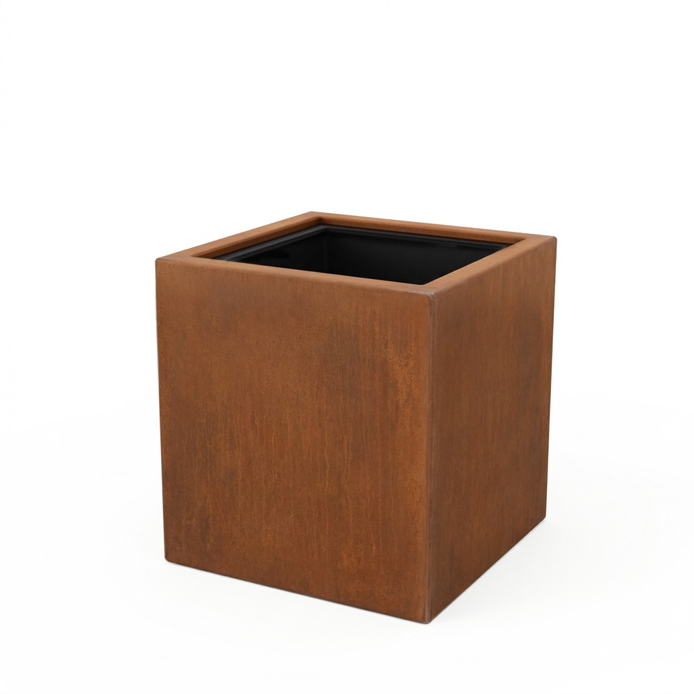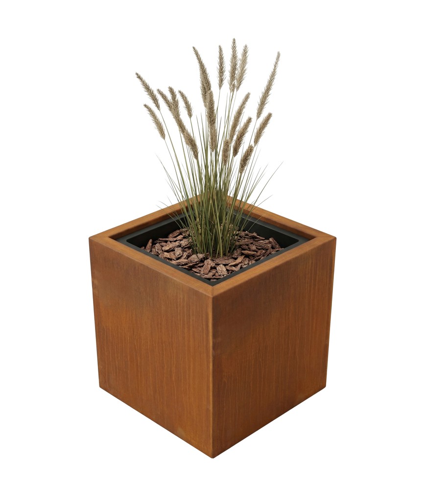 Hranatý květináč z Corten oceli se samozavlažovací vložkou. Jeho oranžovo-hnědý patinující povrch vypadá skvěle a dokonale se kombinuje se zelení. Je možné jej kombinovat s ostatními prvky ze sekce “Modulární sestavy” a vytvořit si tak útulné zátiší s květinami. Budete svědky toho, jak se jeho barva mění před očima z živě oranžové na tmavou. Cortenová ocel totiž velice rychle vytváří na svém povrchu ochranou vrstvu ve formě patiny, která ji zároveň chrání před povětrnostními vlivy, takže Vám bude dělat radost velice dlouho. Pro usnadnění pěstování květin je osazen samozavlažovací vložkou v rozměru 390 x 390 mm.
